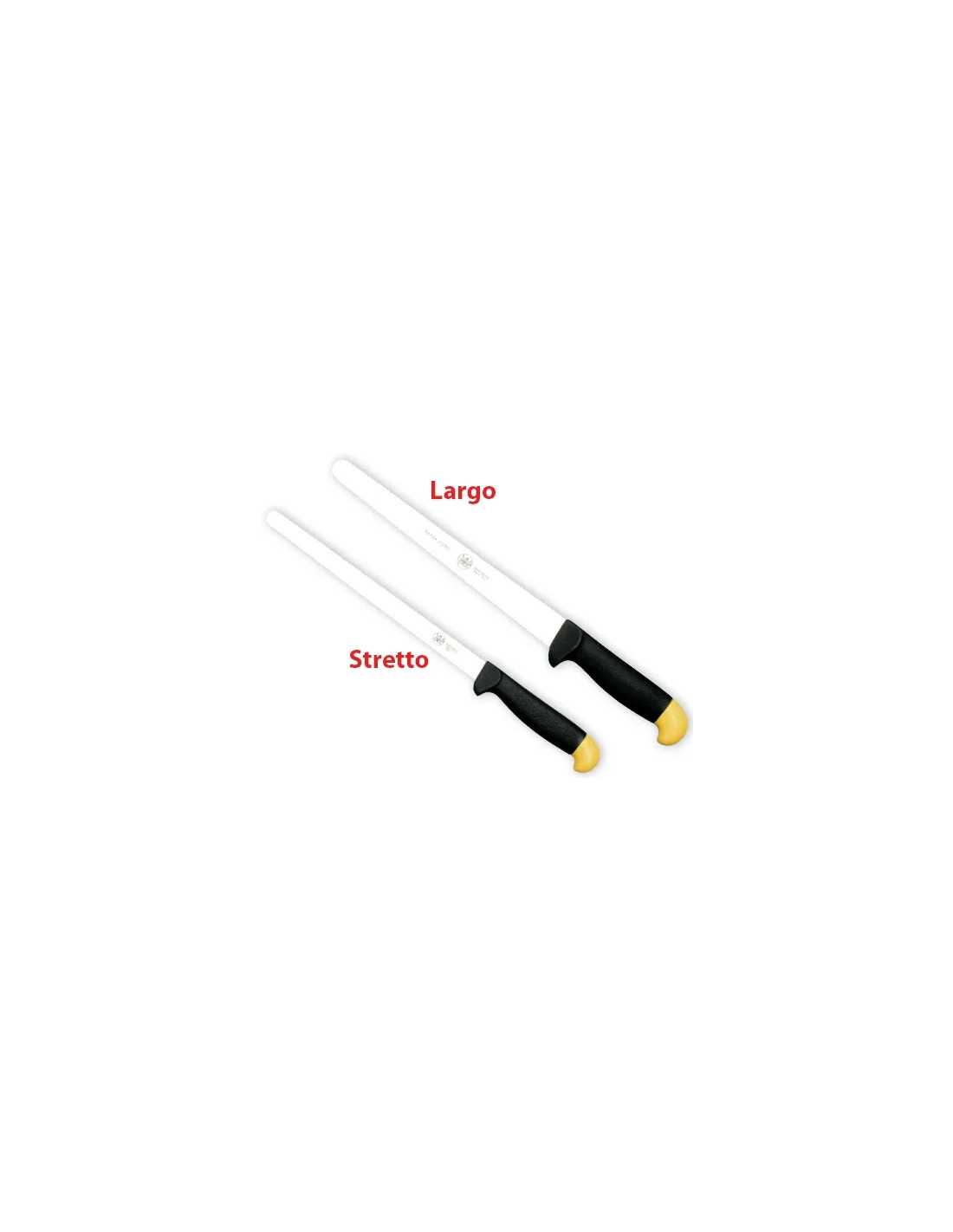 Coltelli per prosciutto Due Buoi 811 con lama in acciaio inox da 26 cm e manico ergonomico in plastica antibatterica e antiscivolo. Confezionato in busta self service.