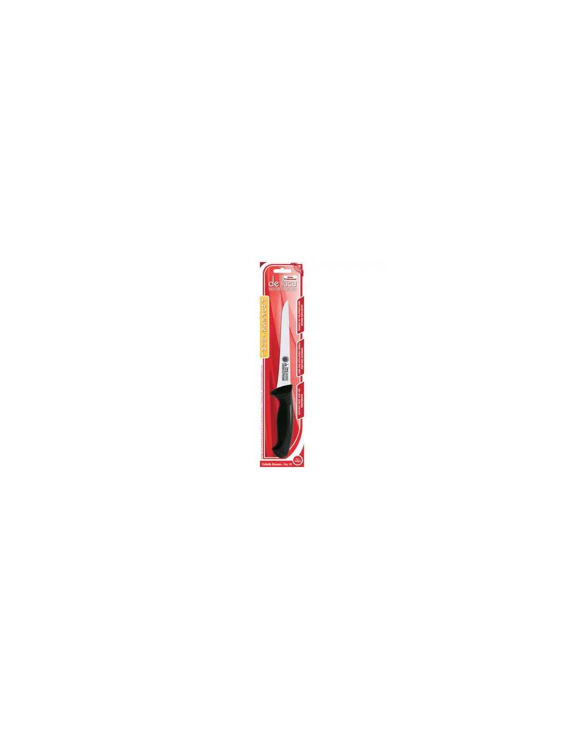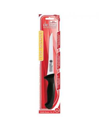COLTELLO MACELLAIO DISOSSARE PROFESSIONAL DE LUCA è un coltello professionale ideale per disossare carne, grazie alla lama in acciaio inox AISI 420 temperato. La sua affilatura conica e la finitura satinata assicurano precisione e resistenza, mentre il manico in polipropilene nero garantisce una presa salda e confortevole durante l'uso.