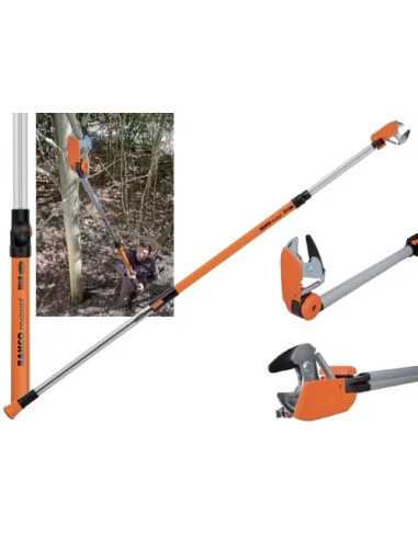 Svettatoio telescopico in alluminio per un taglio fino a 6 metri. Testa regolabile fino a 230° per lavorare con diversi angoli di taglio, sistema di scorrimento a leva facilita il taglio per rami fino a Ø 32 mm., impugnatura scorrevole per la massima potenza di taglio e impugnatura inferiore aggiuntiva per raggiungere la massima altezza.