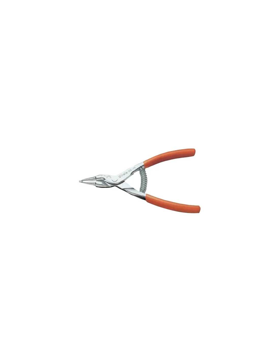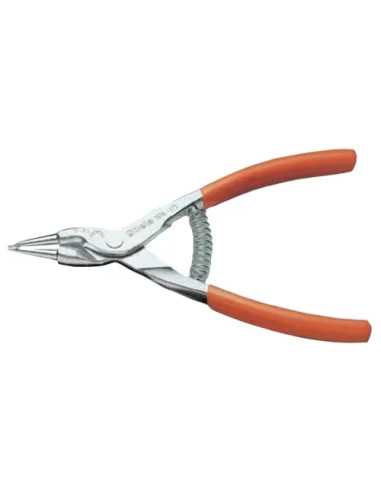 Pinze a becchi diritti per anelli Beta 1036, ideali per anelli elastici di sicurezza per alberi. Modello cromato lucido con manici ricoperti in PVC, conformi agli standard UNI 7915 e DIN 5254. Lunghezza totale di 175 mm.
