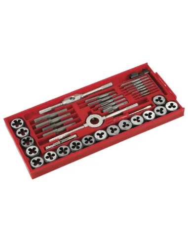 Set Maschi e filiere è un assortimento completo di strumenti indispensabili per lavori di precisione in acciaio utensile, contenuti in una pratica cassetta di plastica. Ideale per professionisti e hobbisti che cercano qualità e versatilità in un unico kit.