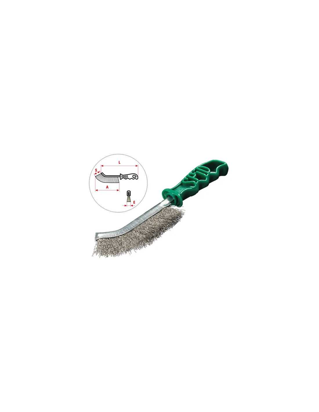 Spazzole Spid inox è una spazzola manuale universale ideale per rimuovere ruggine, vernice e sporco da qualsiasi superficie. Grazie alla sua superficie ristretta, curvatura speciale e manico ergonomico, permette di lavorare con forte pressione e di raggiungere spazi di difficile accesso. Il filo in acciaio inox di diametro 0,3 mm assicura prestazioni di alta qualità. Dimensioni: L 245 mm, A 135 mm, S 28 mm, E 15 mm.