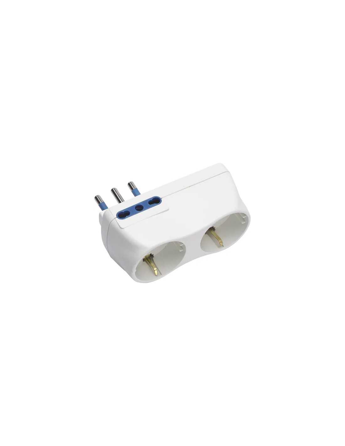 Adattatore quadruplo con spina 2P+T 16A e 2 prese 2P+T 16A bipasso, più 2 prese schuko. Colore bianco. Confezione in busta inclusa.
