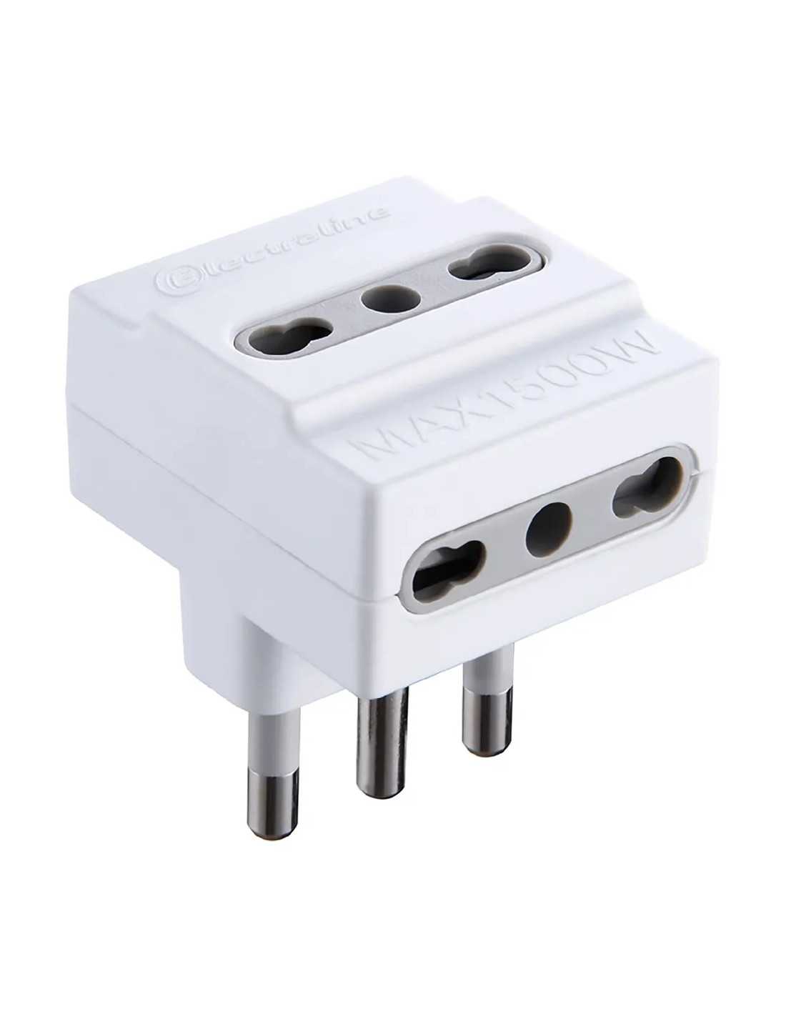 ADATTATORE TRIPLO ELECTRALINE art. '71923' è un pratico adattatore con presa 3 x 2P+T10A e spina 2P + T10A, ideale per collegare più dispositivi contemporaneamente. Sfuso in scatola e certificato Kema Keur.