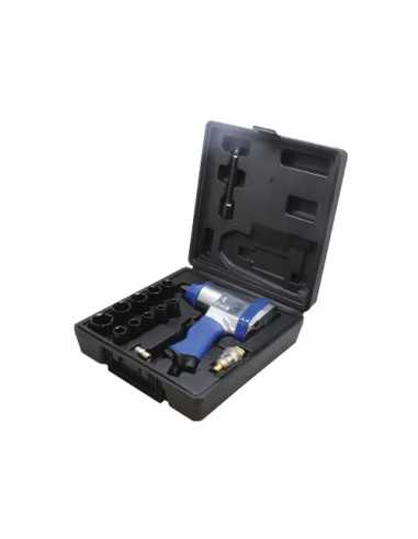 Kit completo di avvitatori pneumatici per aria compressa con attacco bussole 1/2, pressione da 6 a 8 Bar e attacco aria 1/4. Include 10 bussole, prolunga accessori e lubrificatore per un utilizzo versatile e efficiente.