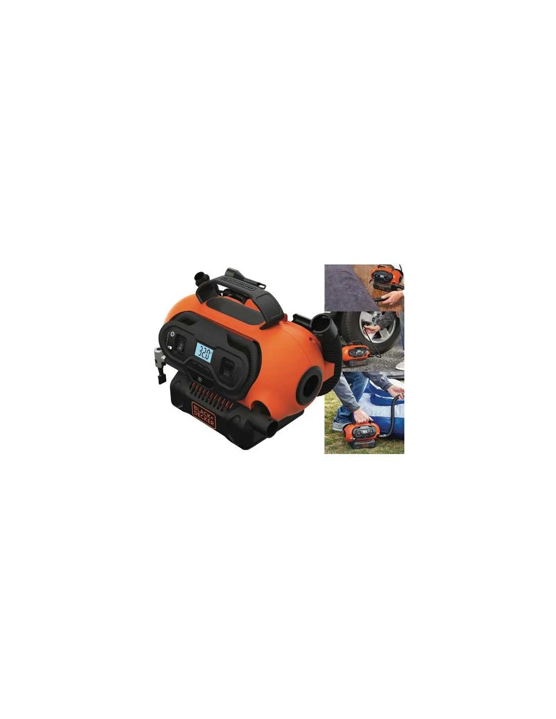 Compressori B+D portatili BDCINF 18 sono dispositivi versatili che possono essere utilizzati con presa accendisigari 12 Volt, 230 Volt o con batteria al Litio 18 Volt (non inclusa). Dotati di porta per gonfiaggio ad alta pressione e per gonfiaggio ad elevato volume, display digitale con spegnimento automatico e funzione di sgonfiaggio. La pressione massima raggiungibile è di 160 PSI - 11 Bar.