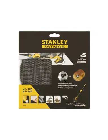 Dischi Abrasivi Stanley FatMax SFM sono ideali per levigare superfici con precisione e efficacia. Questo set include 5 pezzi di dischi abrasivi a maglie di diametro 225 mm, perfetti per la levigatura con la levigatrice per muro SFMEE500S. La confezione contiene 2 dischi grana 120 e 3 dischi grana 240, garantendo risultati ottimali in ogni situazione.