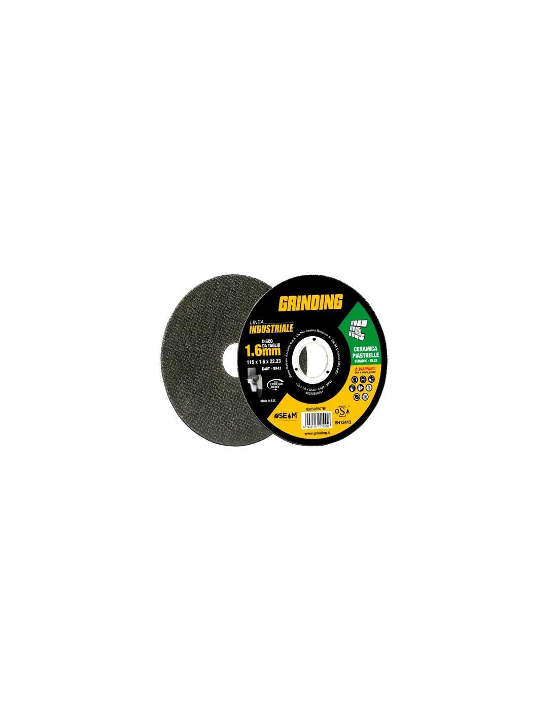 Dischi Grinding Industriale ceramica: ideali per tagliare piastrelle e profilati in bronzo e ottone. Realizzati con abrasivo al carburo di silicio, certificati secondo normativa EN 12413:2007 A1 2010. Dimensione Ø 115x1,6 mm, foro 22,2 centro piano.