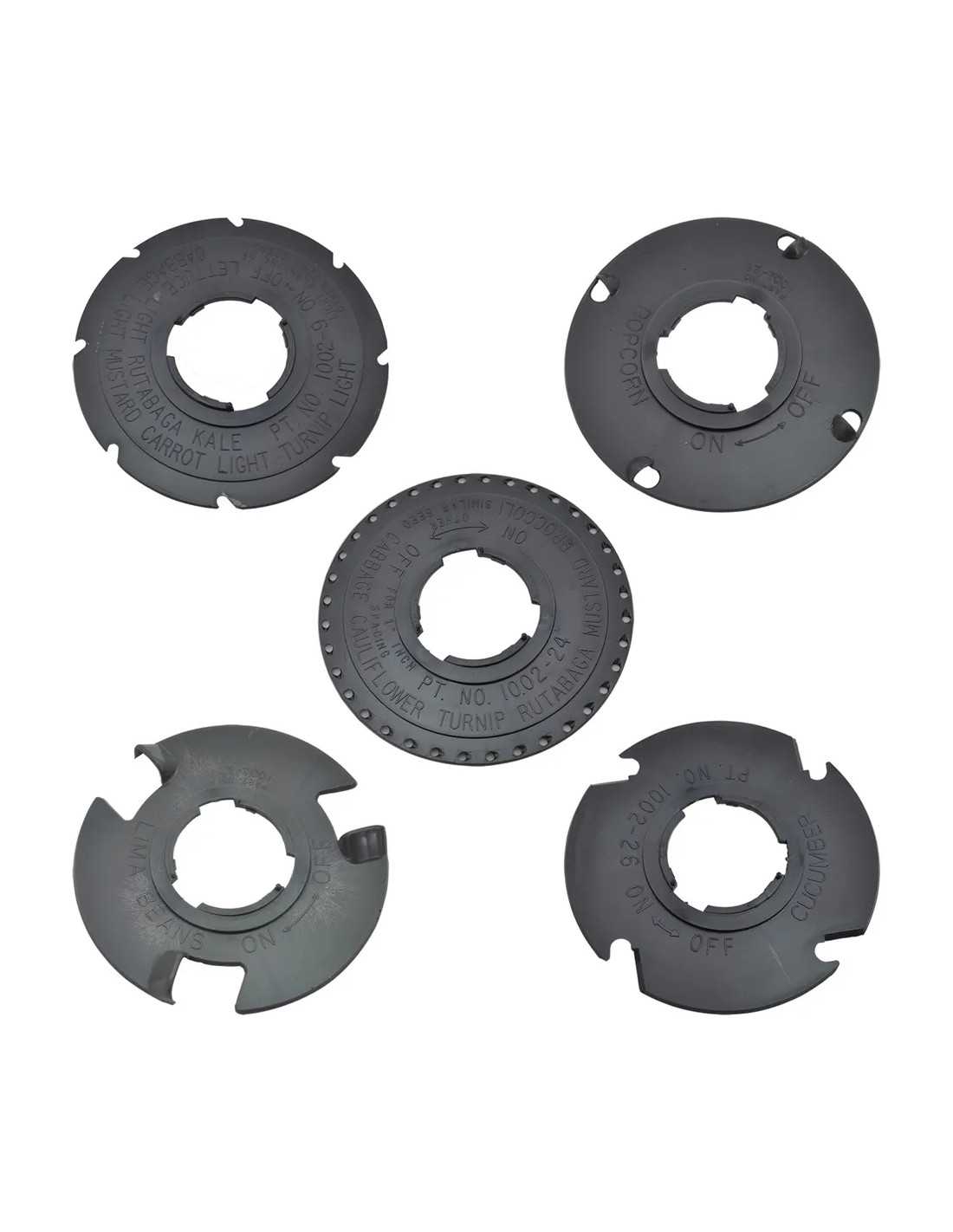 Set di 5 dischi supplementari per seminatrice manuale, ideali per diversi tipi di coltivazioni come carotine, lattuga, broccoli, cetrioli, fagioli e molto altro. Ogni disco ha una spaziatura specifica per una semina precisa e uniforme.