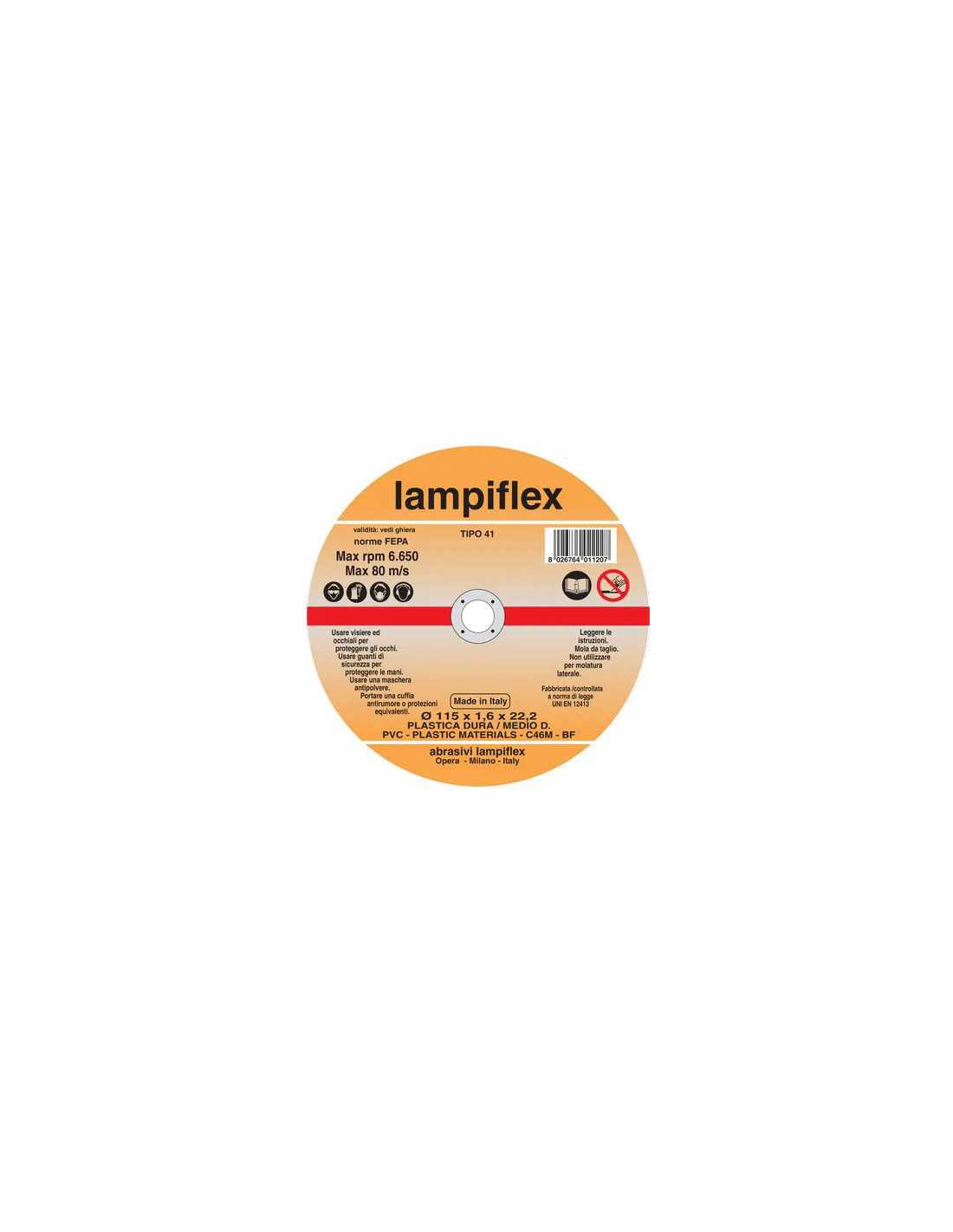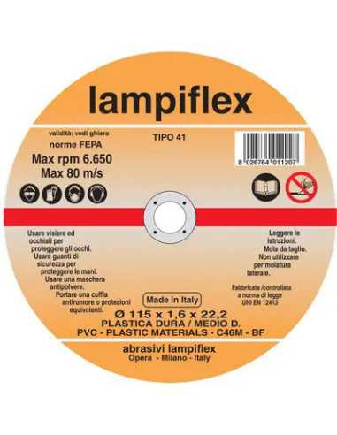DISCO ABRASIVO TAGLIO PVC LAMPIFLEX è ideale per materiali plastici di medio piccole sezioni come pvc, plexiglas, bakelite, policarbonato ad alta resistenza, profilati, tubi, grigliati e lastre.