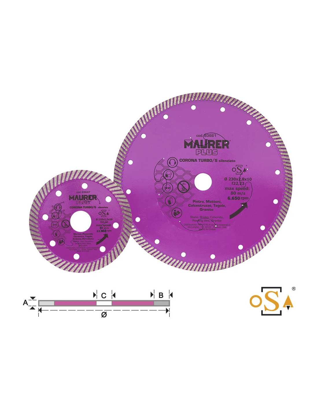 DISCO DIAMANTATO CORONA TURBO/S 230MM MAURER PLUS è un disco diamantato di alta qualità con anima in acciaio speciale, ideale per il taglio a umido e a secco. Perfetto per materiali come pietra, mattoni, calcestruzzo, tegole e granito. Confezione in blister.
