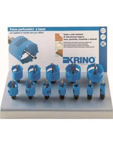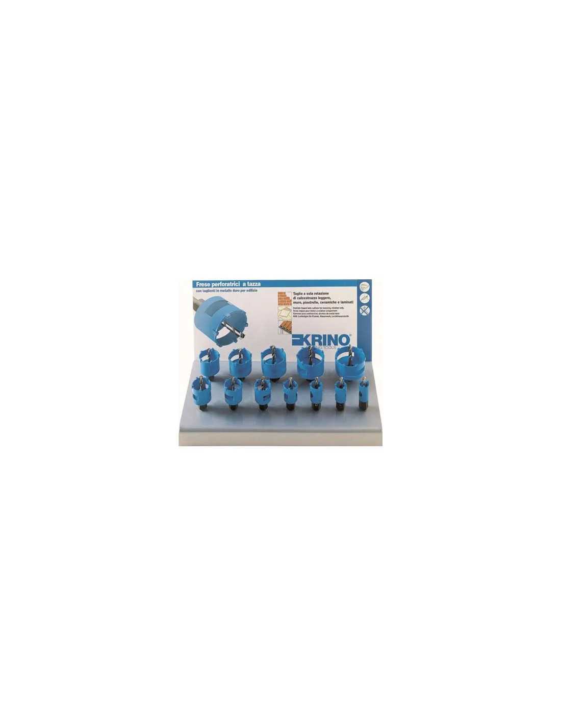 Le frese a tazza a rotazione in metallo duro (widia) della linea KRINO sono ideali per forare a sola rotazione calcestruzzo leggero, muro, piastrelle, ceramica e laminati plastici. Con codolo esagonale e punta di centraggio, sono disponibili in un pratico espositore da banco da 12 pezzi con diametri vari: 22-25-27-30-35-38-40-45-50-55-60-65 mm.
