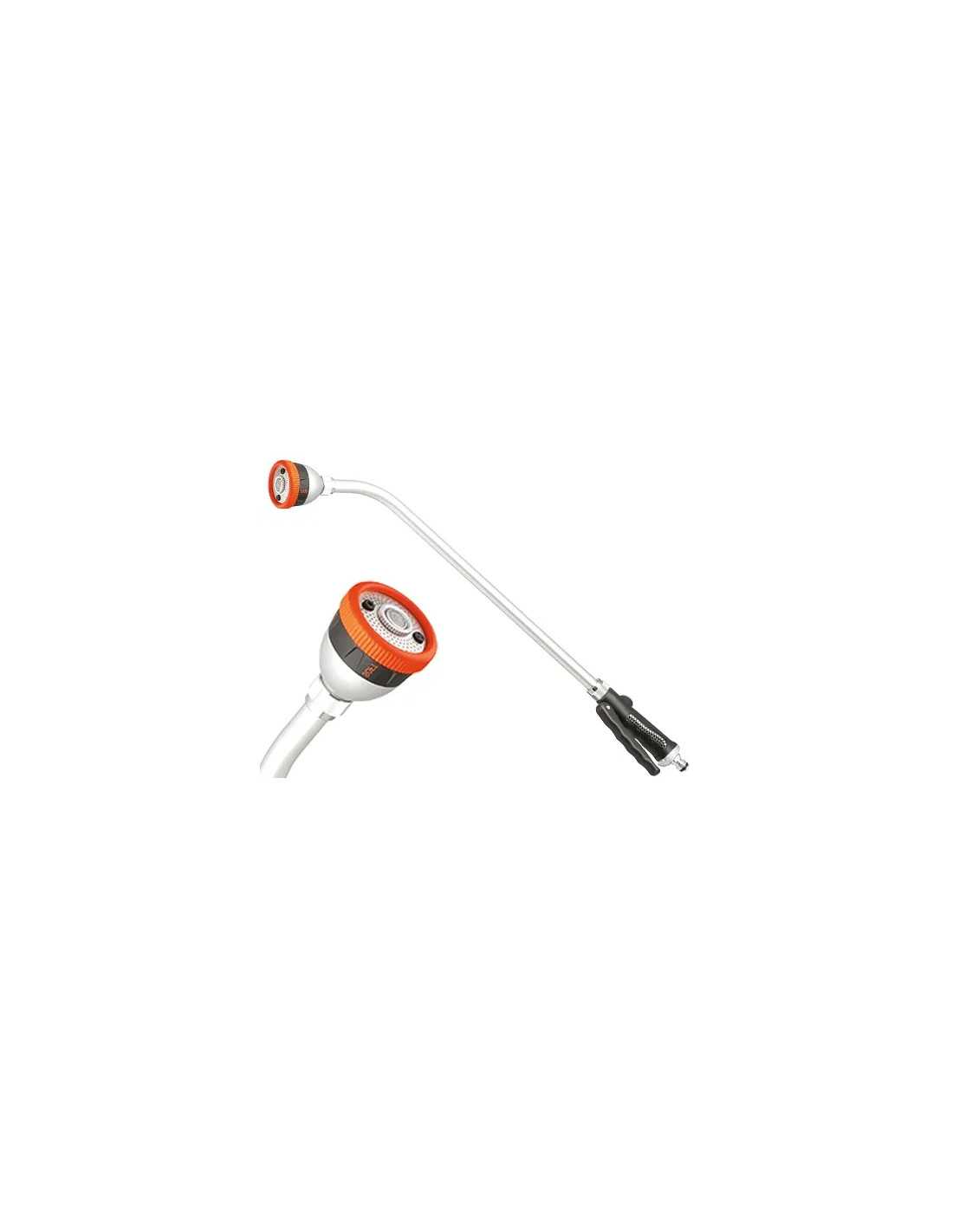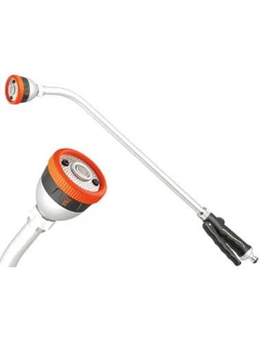 Lancia in metallo cromato con impugnatura ergonomica e piastra forata in acciaio inossidabile. Dotata di leva di regolazione del flusso d'acqua e dispositivo di fissaggio del getto. Offre 4 tipi di getti regolabili: doccia, concentrato, nebulizzato e aerato. Lunghezza di 70 cm.