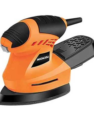 LEVIGATRICE ORBITALE 788720 WOKIN, ideale per levigature angolari e piccole superfici. Dotata di platorello con velcro da Mm. 140x140x90, impugnatura antiscivolo e filtro raccogli polvere. Include 3 carte abrasive. Confezionata in scatola.