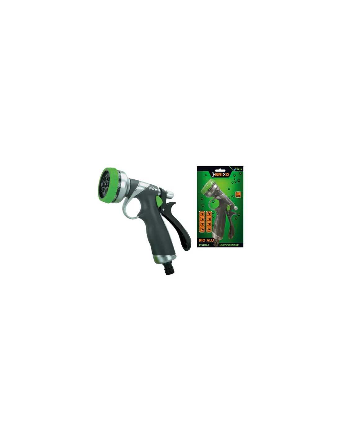 Pistole Brixo Iris Rio Alu multifunzione è l'accessorio perfetto per un'irrigazione precisa e versatile. Con corpo in alluminio resistente, impugnatura ergonomica per un comfort ottimale e blocco erogatore che offre 8 diverse forme di getto dell'acqua, questa pistola ti permette di lavorare in modo efficiente e professionale.
