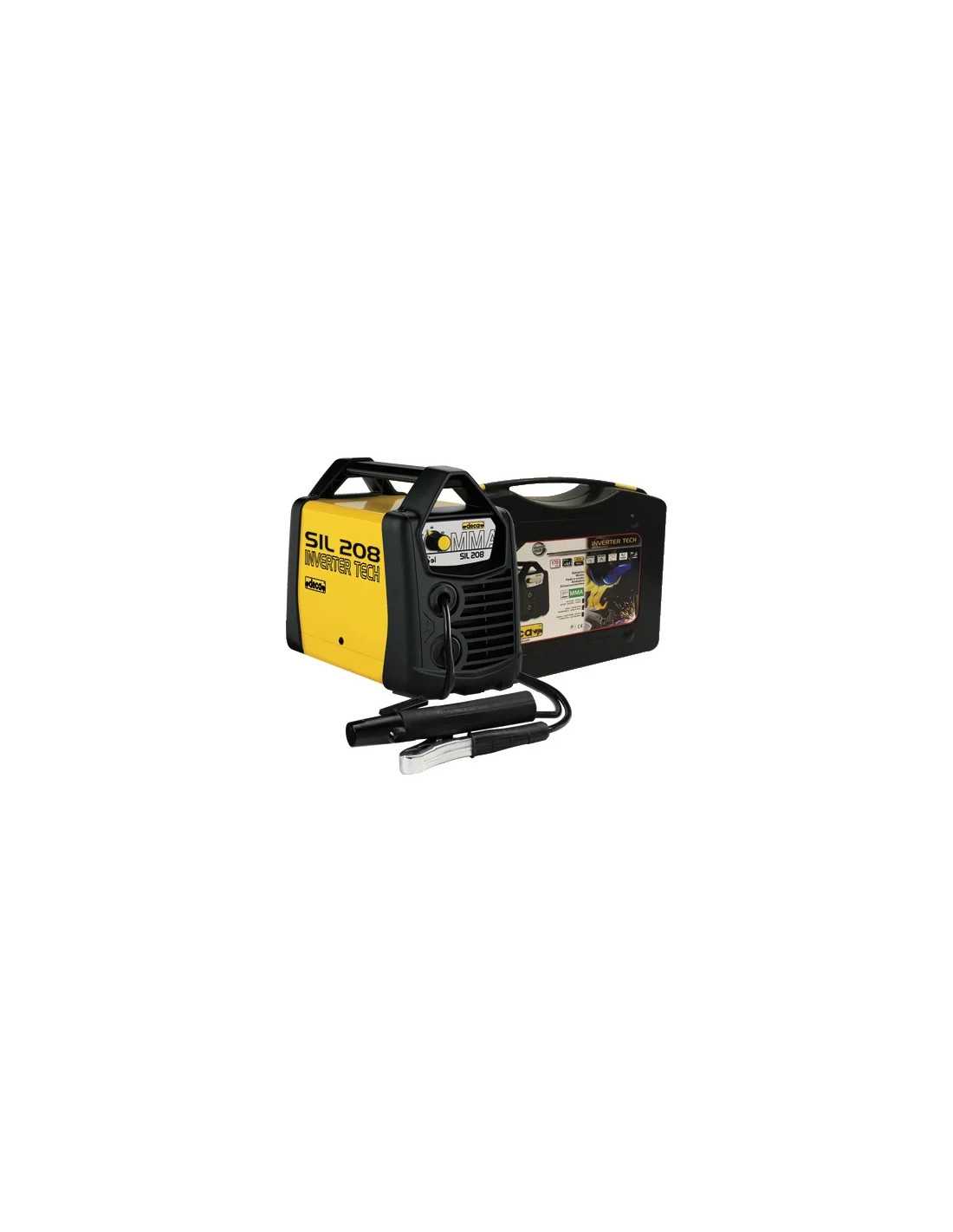 Saldatrici Deca Inverter SIL 208 con alimentazione monofase Volt 230 e potenza assorbita di 1,5 kw. Regolazione da 10 a 80 Ampere, adatta per elettrodi con diametro da 1,6 a 2,5 mm. Completa di accessori e valigetta per un utilizzo pratico e professionale.