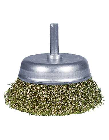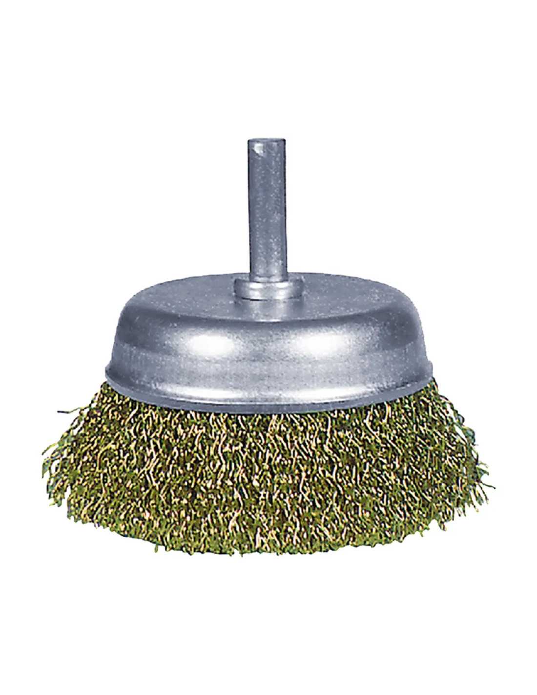 Spazzola a tazza per trapano di diametro 50mm, con filo in acciaio ottonato ondulato. Ideale per lavori di manutenzione e pulizia leggeri.