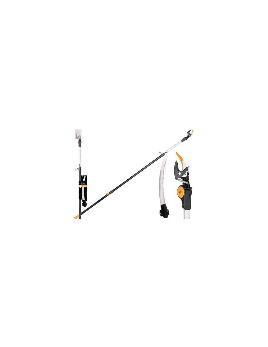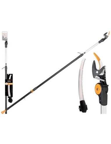 Svettatoi Universali Gard Cut + Seghetto UPX86 + UP80 Fiskars è l'ideale per tagliare rami fino a Ø38 mm. con precisione e facilità. La lama in acciaio bypass permette di tagliare legno verde fino a Ø32 mm., mentre il manico estensibile da 2,4 a 4 mt. consente di raggiungere anche i rami più alti, fino a 6 mt. di altezza. Con angolo di taglio regolabile di 230° e impugnatura SoftGrip antiscivolo, è comodo e sicuro da utilizzare. Il seghetto incluso è perfetto per tagliare rami più spessi, con una lama in acciaio inox dentata di 45 mm.