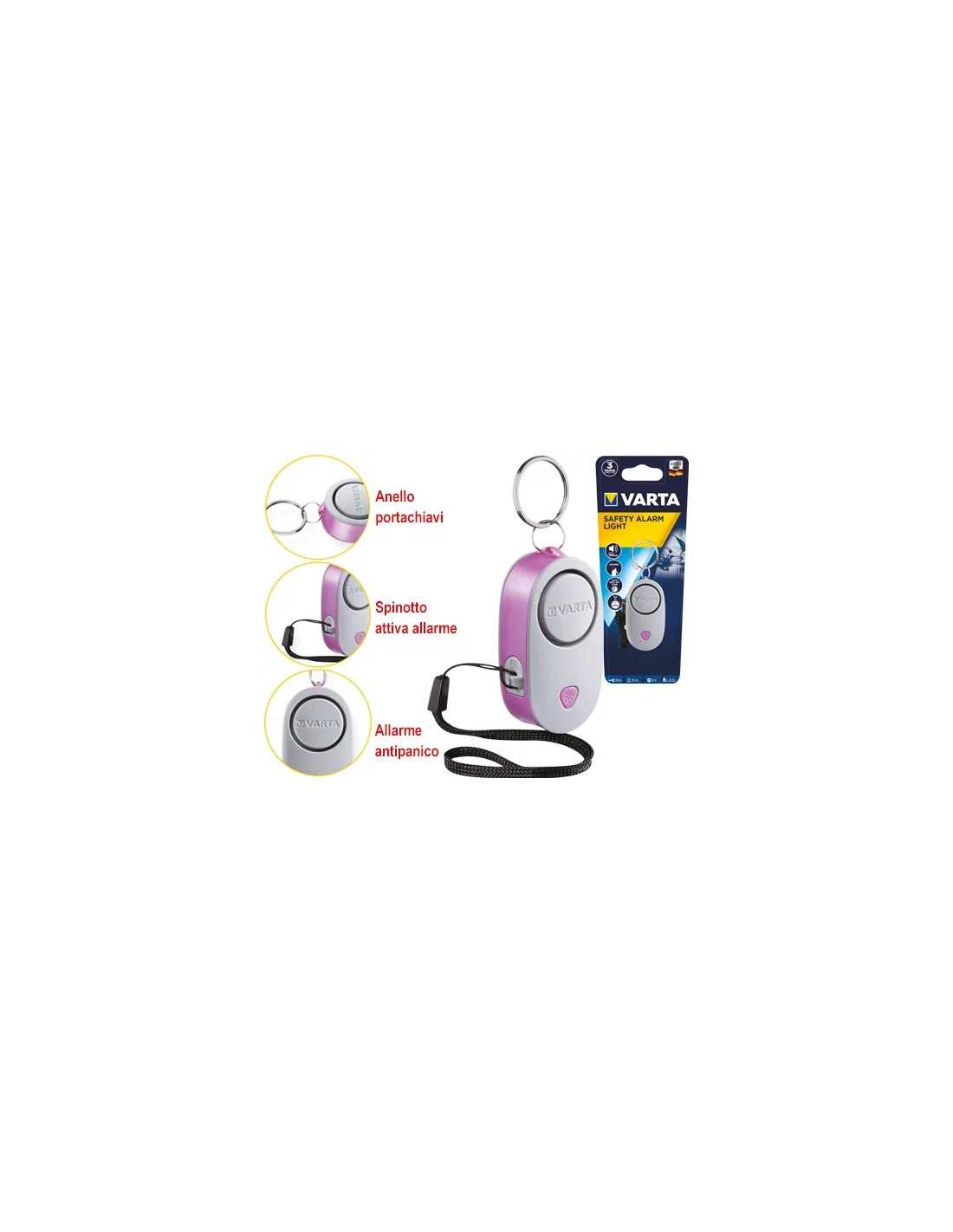 Torcia Varta Safety Alarm Light 16622 con LED da 5mm, allarme antipanico fino a 100 dB e luce stroboscopica per attirare l'attenzione. Attivazione antipanico tramite cordino, protezione da attivazione accidentale e spegnimento automatico. Include batterie e pratico anello portachiavi. Piccola e potente, ideale per la ricerca di oggetti al buio.