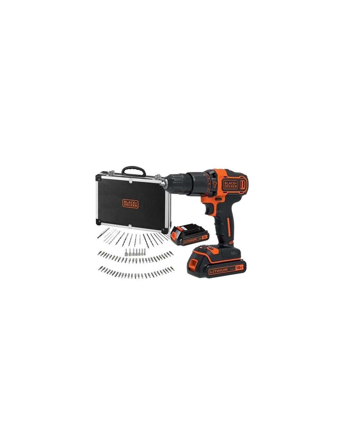 Trapano a percussione a batteria B+D BDCHD 18 BAFC. Potente trapano con percussione e mandrino autoserrante da 10 mm. a 2 ghiere, dotato di luce LED e regolazione della coppia di serraggio. Include 2 batterie, caricabatterie, 80 accessori e valigetta Premium.