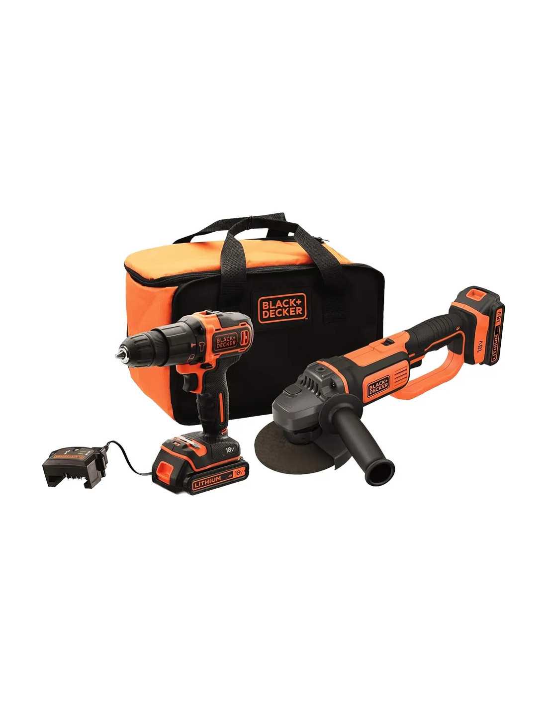 Kit trapano avvitatore a batteria con percussione + smerigliatrice BLACK DECKER 'BCK24D2S-QW' 18V - 2 ah Litio. Ideale per lavori di perforazione e smerigliatura, include trapano con coppia di serraggio 40 Nm e smerigliatrice disco Ø 125 mm.