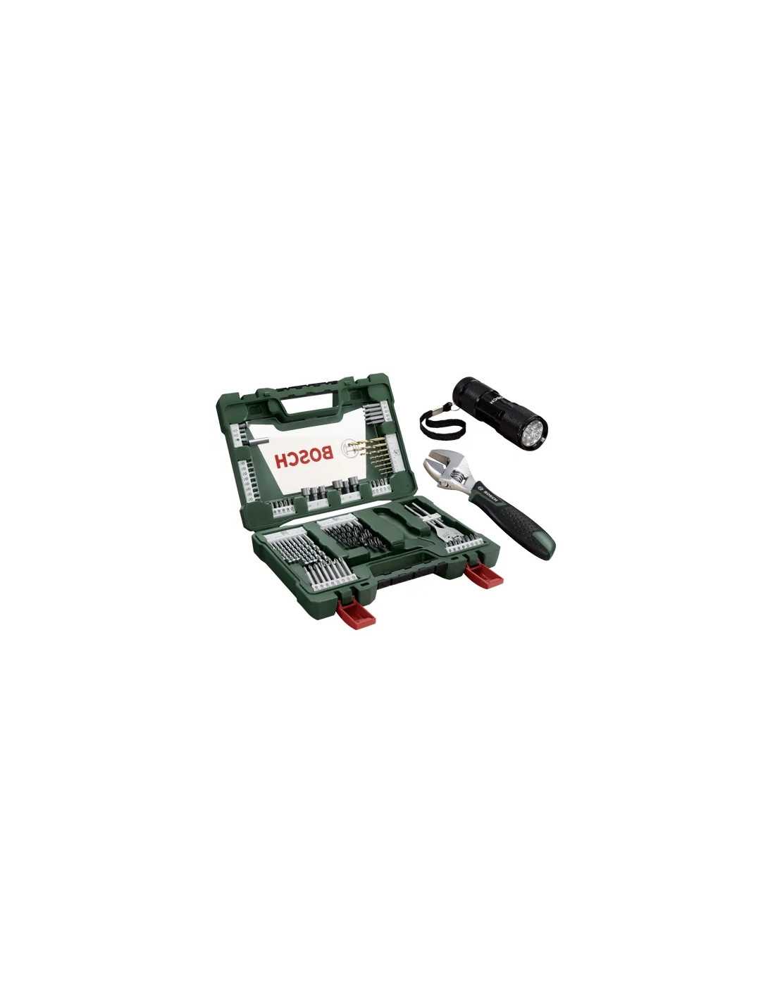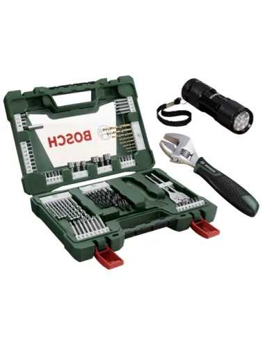 Valigette + set accessori Bosch 83 pezzi è un set completo per foratura e avvitatura che include punte in metallo HSS-TiN, punte per muro e punte per legno, oltre a bit di avvitamento di varie dimensioni, bussole, svasatore conico, torcia a led e chiave a rullino.