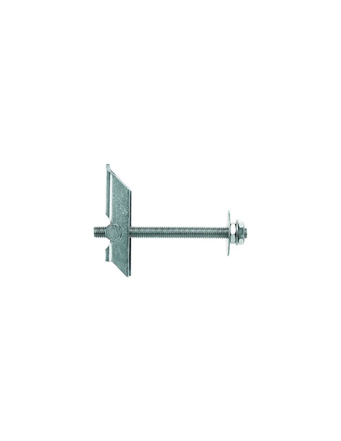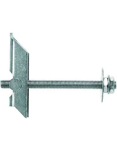 Ancora in acciaio zincato con traversina ribaltabile e barra filettata. Ideale per fissaggio su calcestruzzo alveolare, pannelli in gesso e mattoni forati. Include 2 dadi da 6 MA.