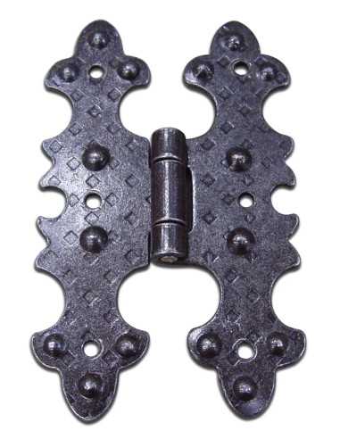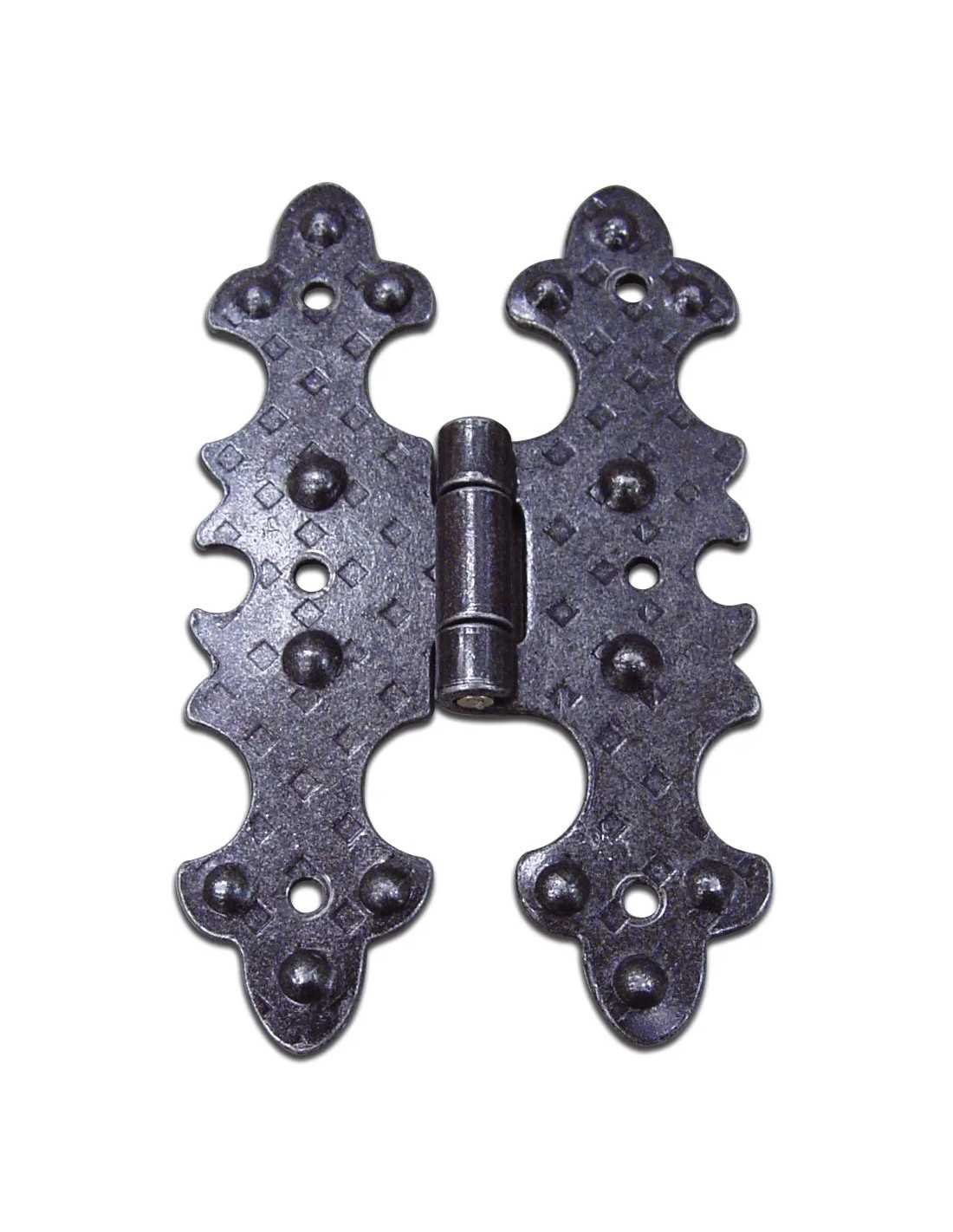 Cerniera in ferro battuto ala piana dal design elegante e rustico, ideale per porte e portoni. Realizzata con materiali di alta qualità per garantire resistenza e durata nel tempo. Aggiungi un tocco di stile unico ai tuoi ambienti con questa cerniera caratterizzata da dettagli artigianali.