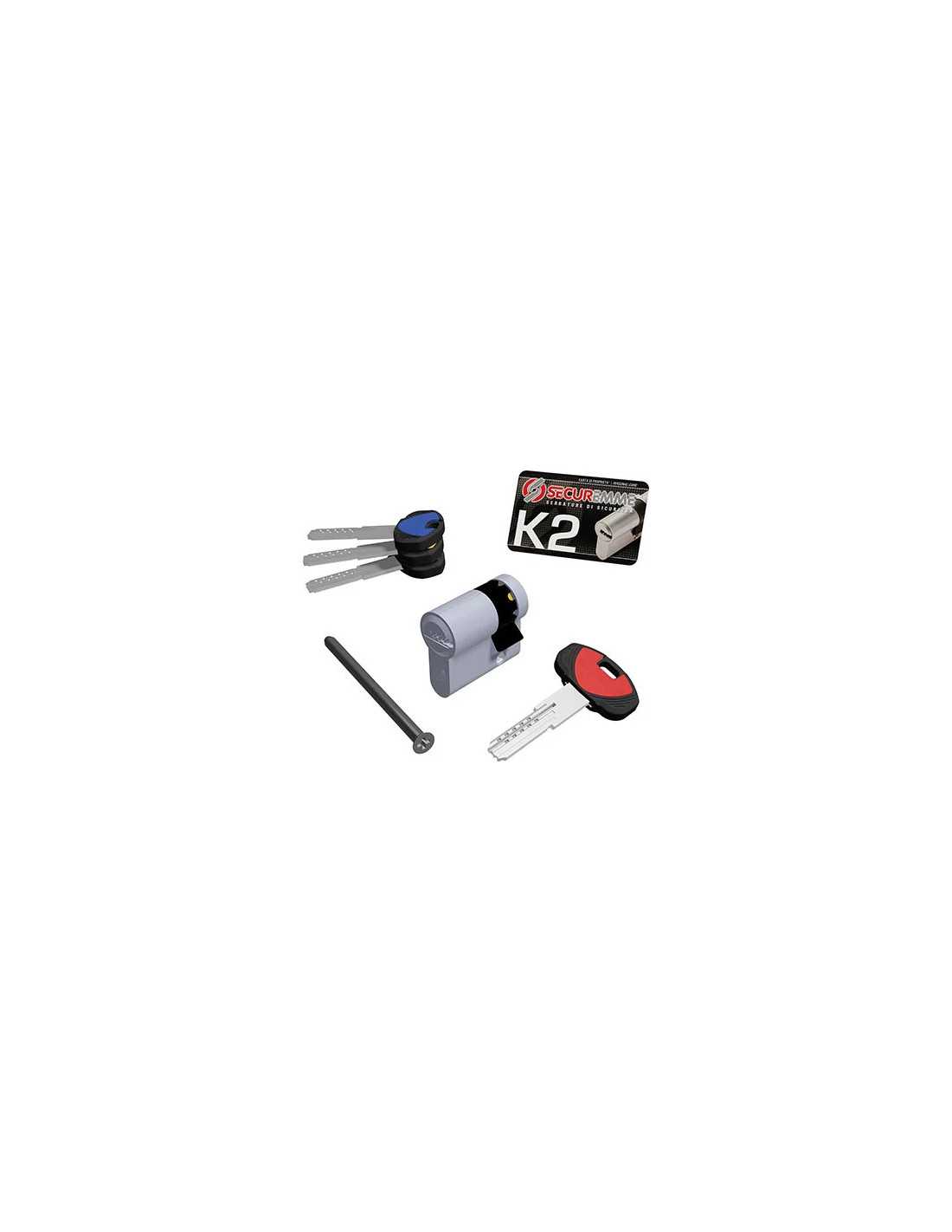 MEZZO CILINDRO SAGOMATO K2 3200-M SECUREMME è realizzato in ottone nichelato satinato ed è fornito con 1 chiave da cantiere e 3 chiavi punzonate definitive, a duplicazione libera, e vite di fissaggio.